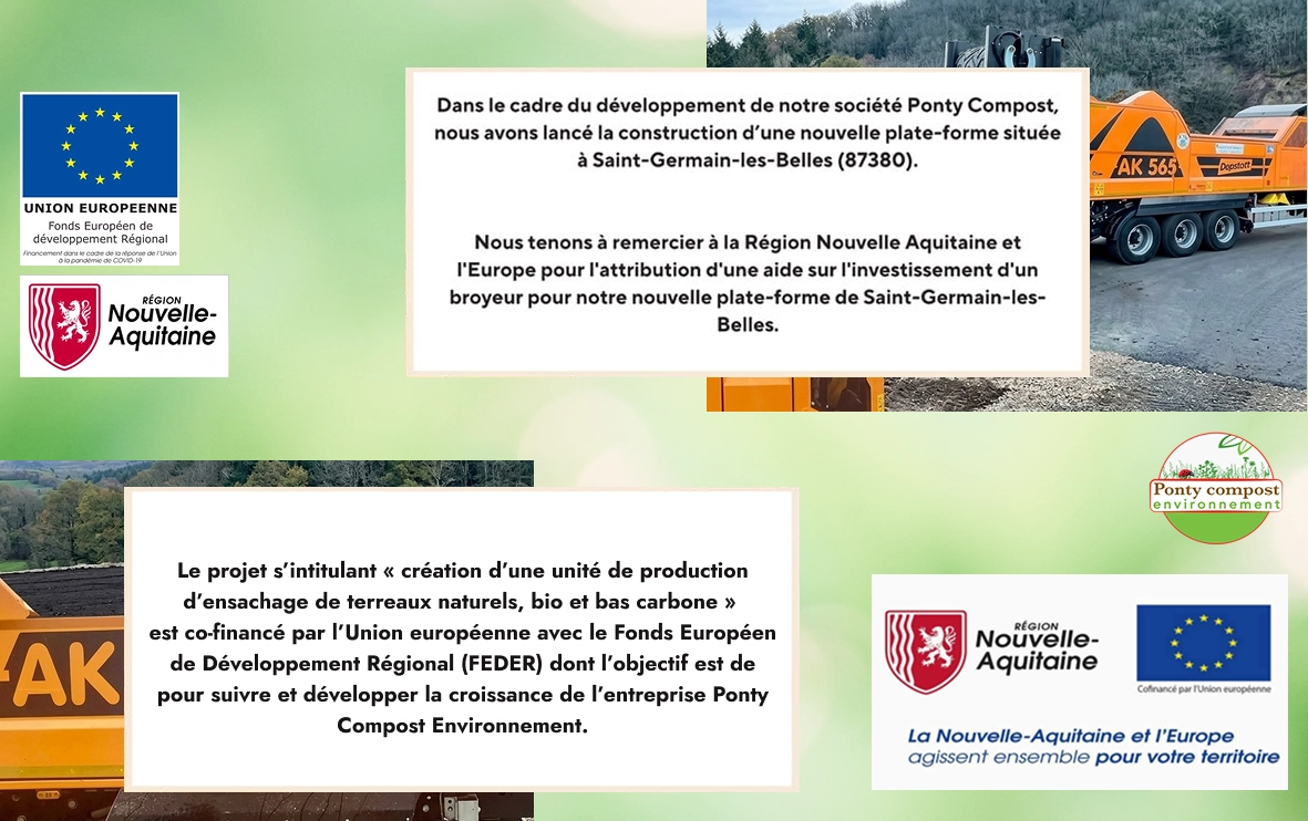 Nous tenons à remercier à la Région Nouvelle Aquitaine et l'Europe pour l'attribution d'une aide sur l'investissement d'un broyeur